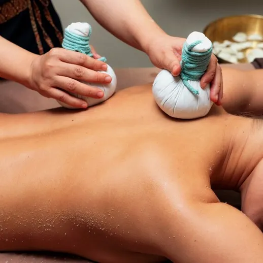 Сеанс начинается с общего массажа тела, выполняемого по тайской методике. После того, как мышцы полноценно разогреются, начинается интенсивное термальное воздействие на организм с помощью наполненных травами горячих мешочков округлой формы.