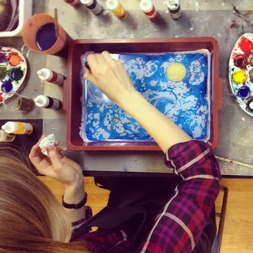 С 11 века человечеству известна техника эбру – рисование жидкими, нерастворяющимися красками на поверхности воды с последующим переносом изображения на бумагу. Этот способ живописи пришёл к нам из Турции, хотя корни его уходят глубоко в культуру Индии и Персии. К слову, «отпечатать» рисунок можно на керамике, холсте или даже дереве, а затем использовать в интерьере, одежде или при создании аксессуаров.
