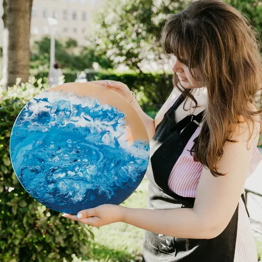 Каждая картина в этой технике получается единственной в своём роде — как отпечаток вашего настроения. Вы сами выбираете цветовую гамму, смешиваете краски со специальным медиумом и заливаете холст, создавая абстракцию, которую невозможно повторить. Мастер подскажет, как работать с жидкостью, убрать лишнее и добиться идеальных разводов. Работа останется сохнуть в студии, а через пару дней вы заберёте её в крафтовом пакете — готовый шедевр для интерьера.