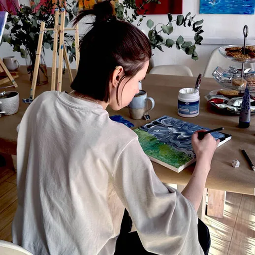 Остановитесь и выдохните. В нашей уютной студии вы сможете забыть о делах и выплеснуть эмоции на холст. Выбирайте, чем писать: акрил, поталь, текстурная паста или мастихин. Художник-преподаватель поможет на всех этапах, а вы просто творите под любимую музыку или в тишине. Вас ждут чай, вино, сладости и идеальная атмосфера для отдыха и самовыражения. Это время только для вас.