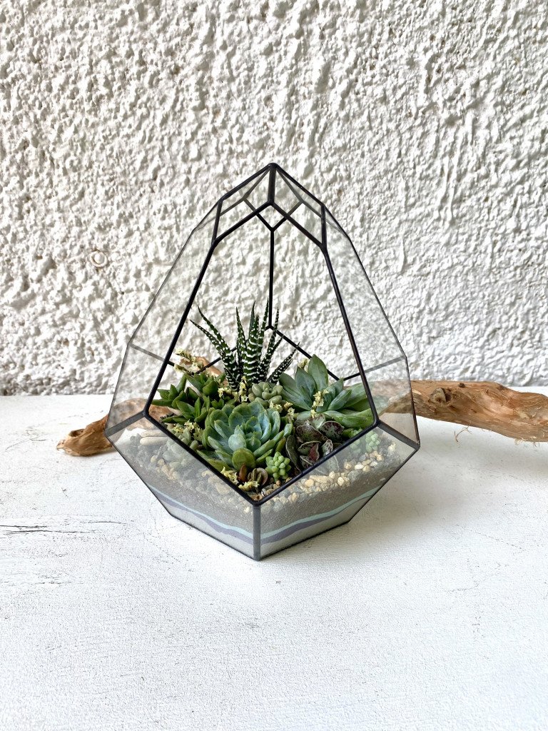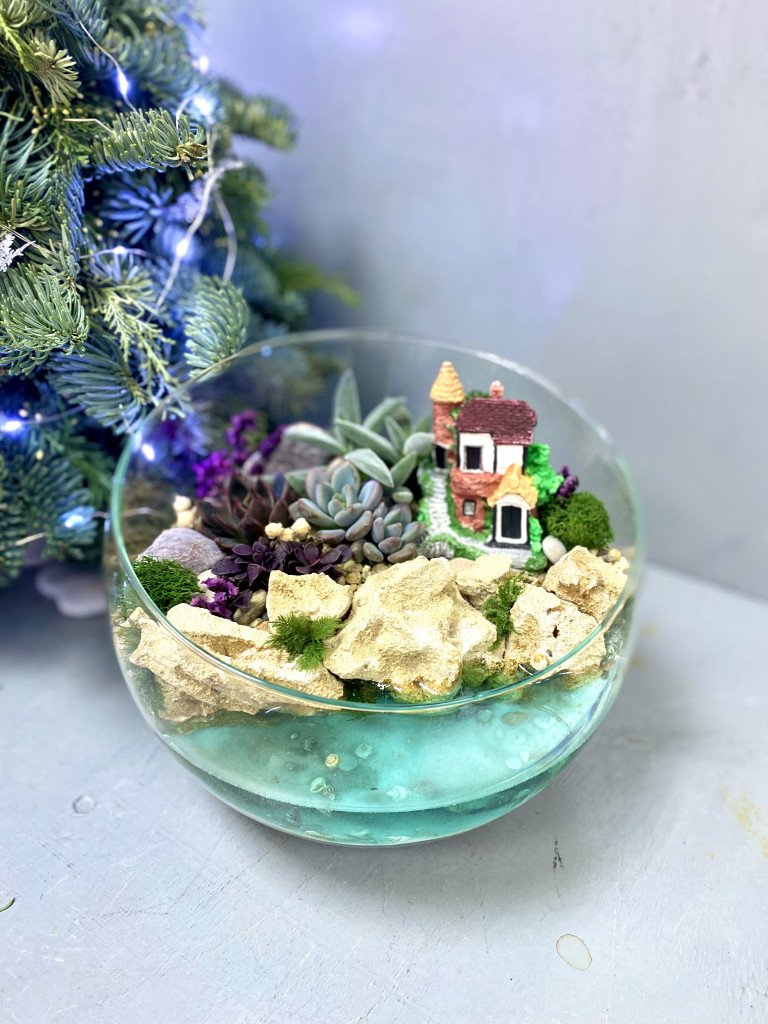 Пакет № 1 Входит: маленькая форма шар, шар с косым срезом, геометрический куб на выбор. Цветные пески, специально подготовленный грунт, 1 растение, декор в виде камней, сухоцветов, ракушек, стабилизированного мха. Можно добавить имитацию водоёма из эпоксидной смолы, фигурки, дополнительные растения по прайсу студии.