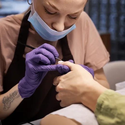 Сочетаются техники аппаратного и обрезного маникюра для создания красивого околоногтевого валика.