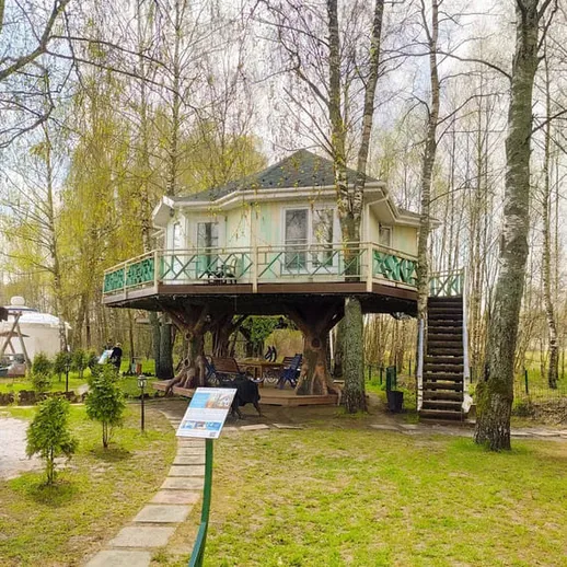 На 4х огромных сказочных деревьях расположился уютный дом с террасой и 2 спальнями в одной из которых подвесная кровать на цепях, уютная гостиная с красивым электрокамином в эко стиле. И конечно все удобства современного мира (Wi-Fi, TV, кондиционер, мини-кухня), в беседке под деревьями вы можете приготовить шашлыки на мангале. Порадуйте себя и близких свежим воздухом, вкусным шашлычком и яркими ощущениями!