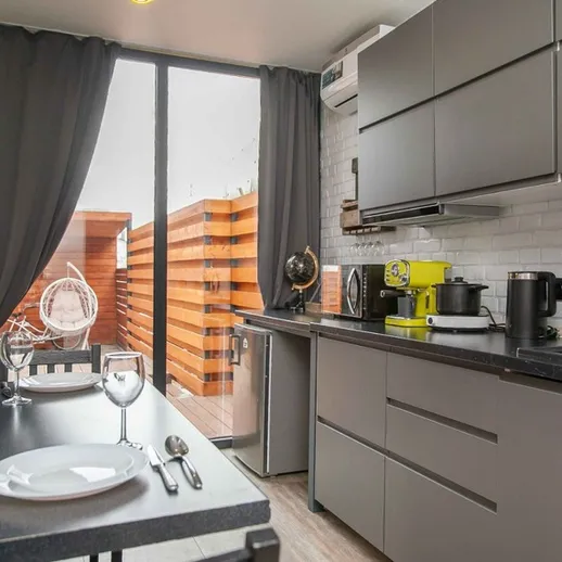 В домике полностью оборудована гостевая кухня (холодильник, микроволновка, плита, чайник, кофеварка и т.д).