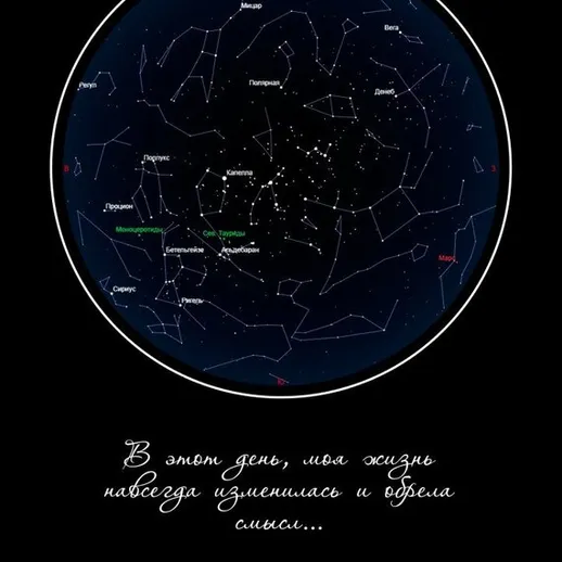 Этот необычный подарок предназначен для всех влюбленных пар, желающих сохранить воспоминания о своем самом важном дне навсегда. Представляем вашему вниманию оригинальную карту звёздного неба, отображающую именно тот рисунок созвездий, каким он был в ночь вашей памятной даты - будь то День Рождения, годовщина свадьбы или другое значимое событие.