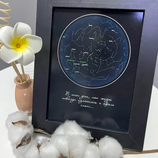 Увековечьте самый важный день в своей истории: карта звёздного неба, воссозданная именно для вашей даты, города и времени. Рисунок созвездий, планет и Млечного Пути в ночь вашего события — будь то свадьба, день рождения или первое свидание — становится уникальным символом любви. Ручная работа, эстетичное оформление на А4 и печать в студии превращают этот подарок в трогательный элемент декора, который будет напоминать о вас долгие годы.