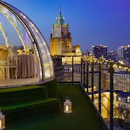 Только вы двое, 100 квадратных метров неба и город у ног. Крыша самого дорогого пентхауса Москвы с панорамным видом на достопримечательности — идеальное место для признаний и свиданий. Уютный купольный домик, свечи, гирлянды, кресло-кокон, телескоп и лёгкий ужин с фруктами и десертами. В подарок — профессиональная фотосессия. Защита от непогоды позволяет наслаждаться вечером в любую погоду. Выбирайте утро, день, вечер или ночь — и создавайте свои звёздные моменты.