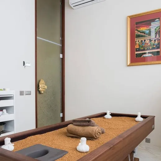 Клиника Aryan предлагает процедуру с использованием горячего песка из целебного камня с расслабляющим и лечебным эффектом — Sand bed. Она представляет собой аюрведический массаж на особой кушетке, заполненной кварцевым песком.